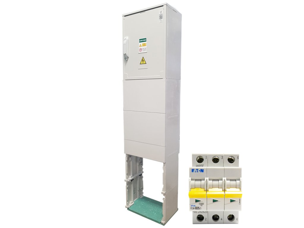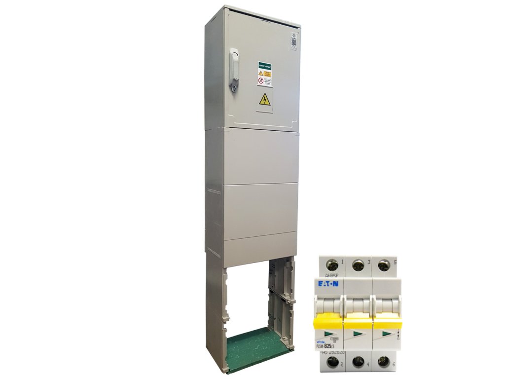 Elektromerový rozvádzač trojfázový, dvojtarif, bez hlavného ističa, istič pred HDO inštalovaný, 1x relé, pilierové zhotovenie s káblovým priestorom (v = 600 mm) a zemným dielom, zaťažiteľnosť do 63 A, zhotovenie pre oblasť SSE, bez okienka. Mximálny prierez kábla prívod/vývod 25mm/25mm.