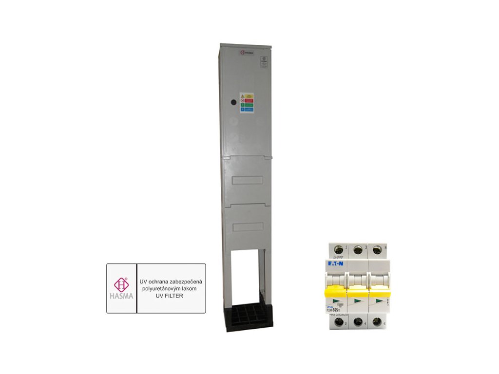 Elektromerový rozvádzač trojfázový, jednojtarif, bez ističa, pilierové zhotovenie s káblovým priestorom (v=500 mm) a zemným dielom, do 63 A, zhotovenie pre oblasť VSD, ZSD bez okienka, dizajn - rýhovaný povrch, rozmer - 260x1540x245 mm (š x v x h), hmotnosť - 15 kg