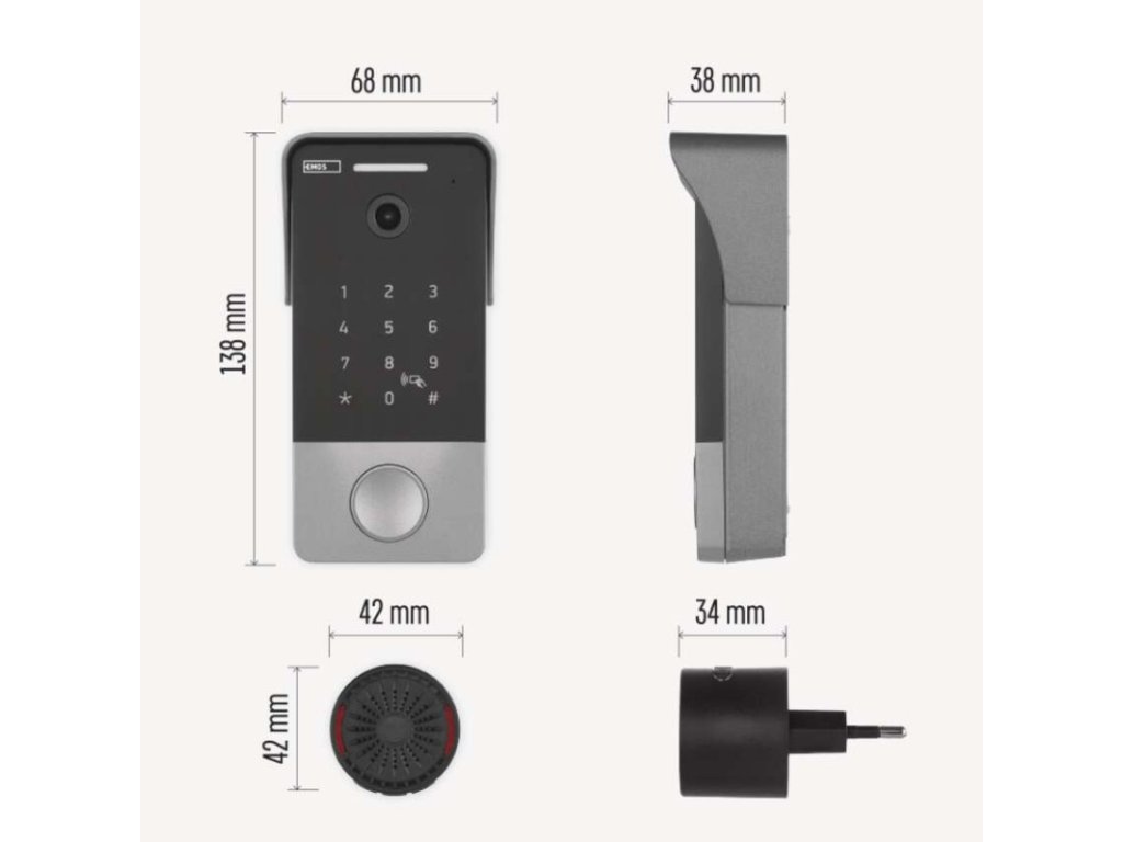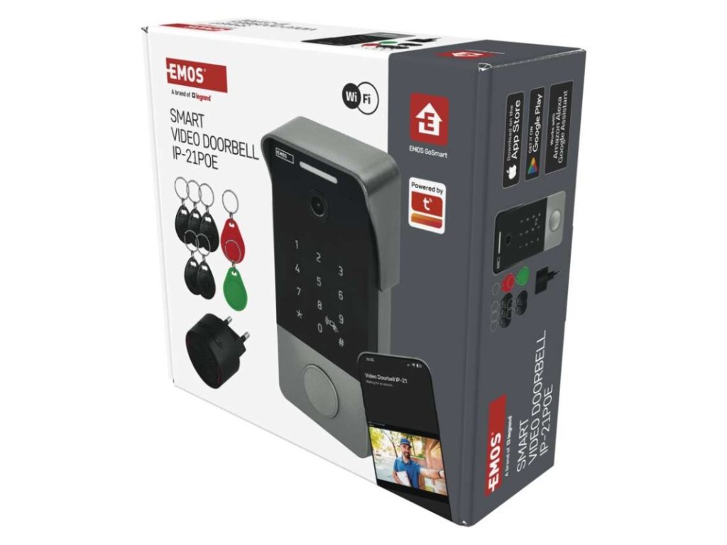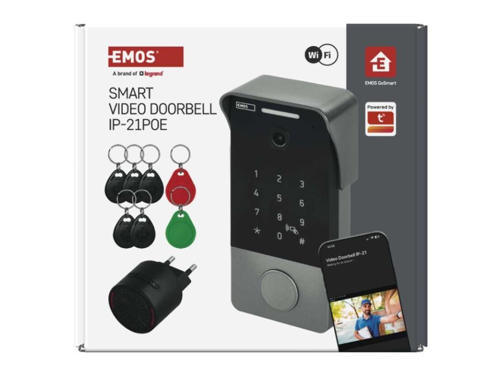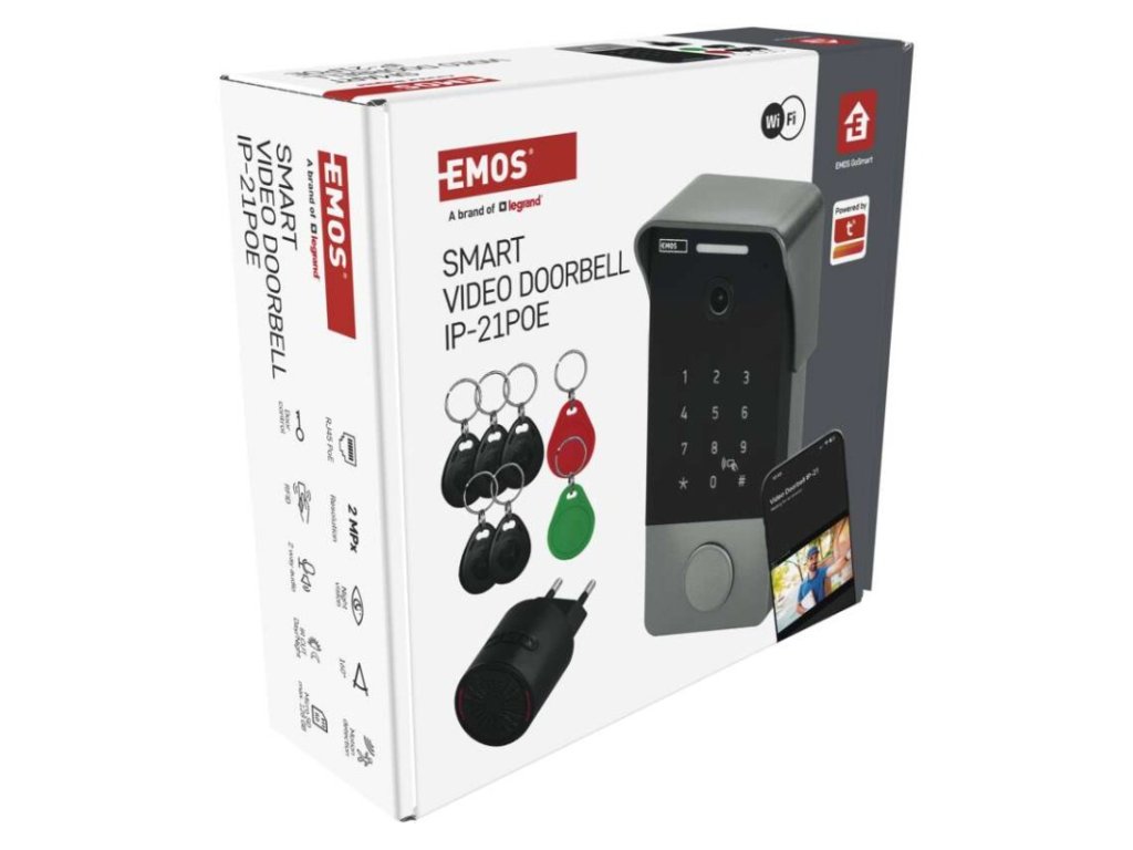 obsah balenia | 1× video zvonček, 1× vnútorný gong, 1× napájací adaptér, 1× redukcia napájania, 1× poe injektor, 1× montážna sada, 7× rfid kľúčenka |