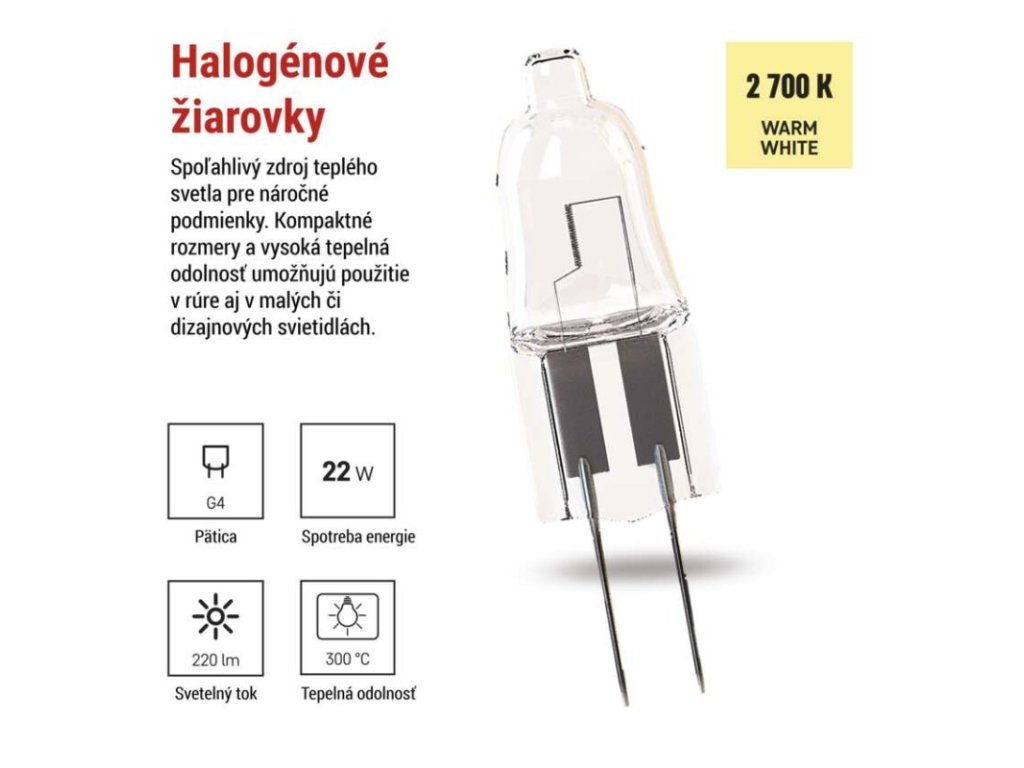 - Spotreba: Ide o halogén s príkonom 14 W. Ak hľadáte energeticky úspornejšie riešenie, zvážte ekvivalentné LED žiarovky s päticou G4.