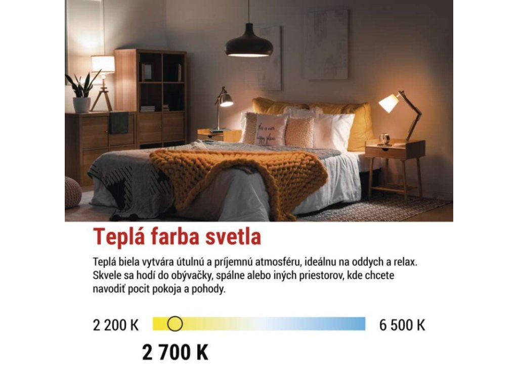 - ✔ Príjemné svetlo: Teplá biela farba (2 700 K) pôsobí upokojujúco a neťahá oči.