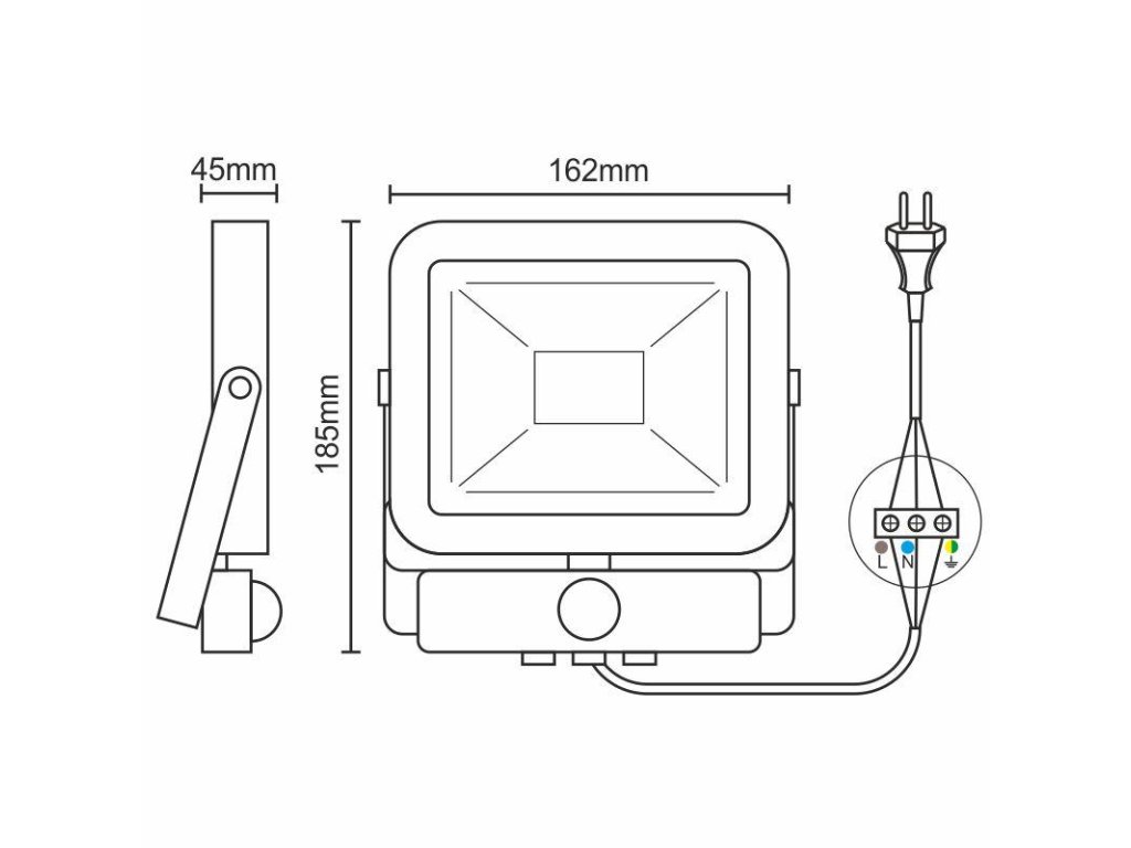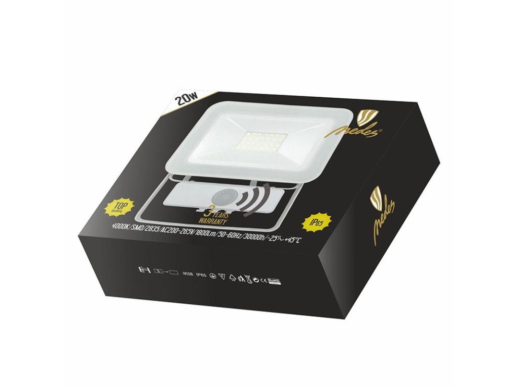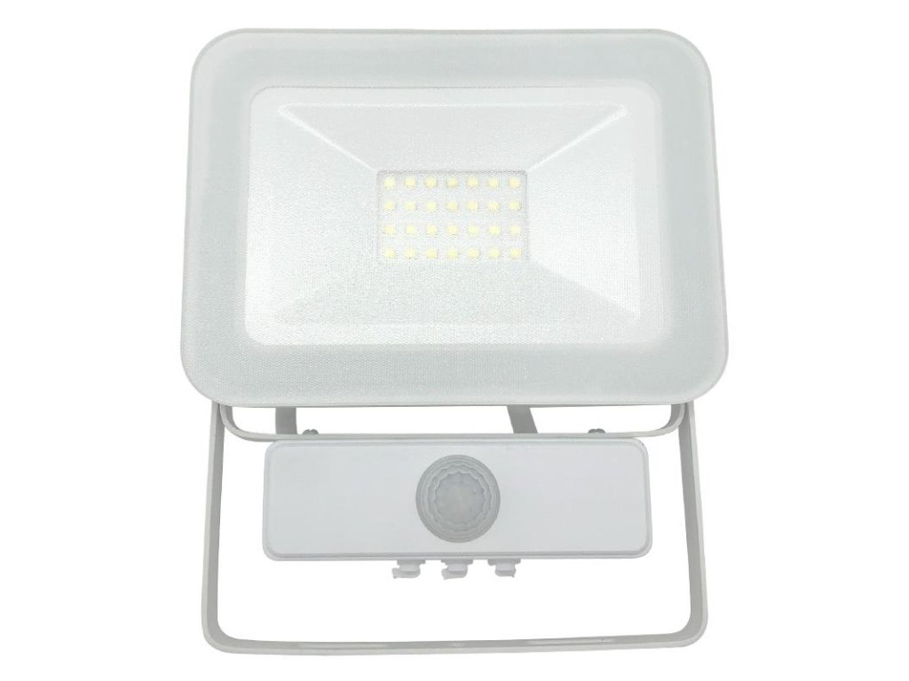 LED reflektor LF2122S v bielej farbe, s výkonom 20W, svietivosťou 1800Lm a farbou svetla 4000K disponuje držiakom, senzorom a vysokokvalitným LED čipom.