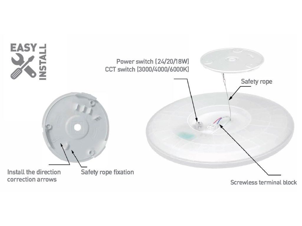 - ✓ Tri farby v jednom (3CCT): Prepínače umožňujú voľbu teplej (3000 K), neutrálnou (4000 K) alebo studenej (6000 K) bielej podľa vašej preferencie.