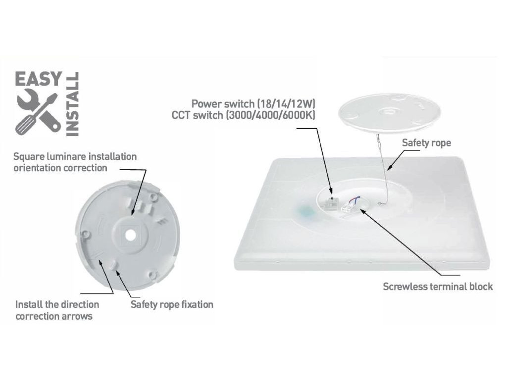✓ Čo overiť pred kúpou: Požadovaný výkon a teplotu bielej farby nastavte manuálne pod krytkou svorkovnice ešte pred finálnym pootočením svietidla na konzolu.