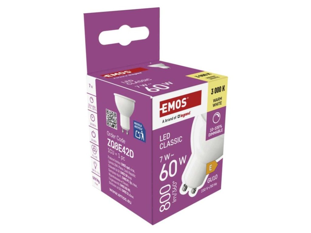 LED žiarovka Classic MR16 / GU10 / 7 W (60 W) / 800 lm / teplá biela / stmievateľné - ZQ8E