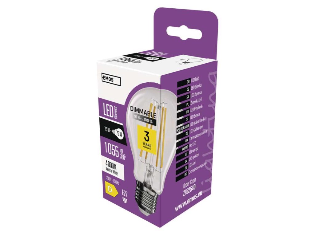 LED žiarovka Filament A60 /E27/7,5 W (75 W)/1 055 lm/neutrálna biela/stmievateľná - ZF5254