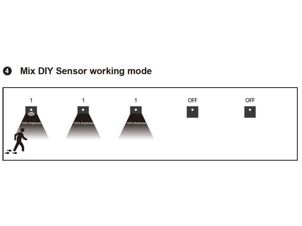 ✓ Práca s módmi (1 / OFF / 2): Prepínač na zadnej strane dovoľuje vytvárať nezávislé skupiny alebo ponechať svietidlo v samostatnom režime OFF.