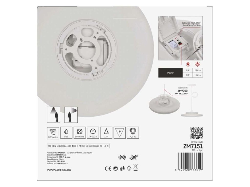 - ✔ Technológia CCT: Možnosť voľby teploty chromatičnosti na 3 000 K (teplá), 4 000 K (neutrálna) alebo 5 700 K (studená biela).