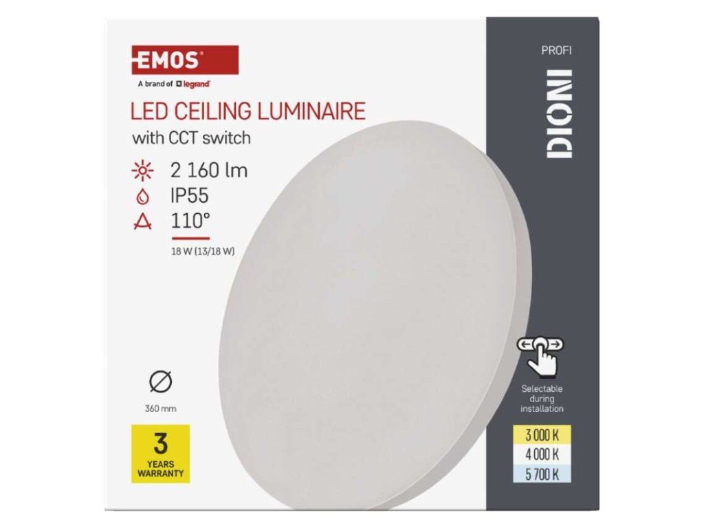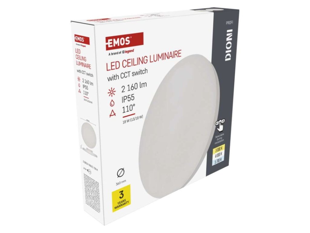 Expertný verdikt: Modelový rad EMOS DIONI sa radí do kategórie PROFI a prináša na trh nevídanú variabilitu. Toto prisadené LED svietidlo (priemer 36 cm) v sebe ukrýva dva mechanické prepínače. Prvým si kedykoľvek pred inštaláciou regulujete výkon (a tým aj svietivosť) na 13 W alebo 18 W. Druhý, takzvaný CCT prepínač, vám umožní zvoliť si jeden z troch odtieňov bieleho svetla. Ak si nie ste istí, aké svetlo sa bude do vašej miestnosti hodiť, s týmto modelom to vyriešite priamo na mieste. Ako obrovský bonus hodnotíme konštrukciu so stupňom krytia IP55, vďaka ktorej svietidlo bez problémov odolá vlhkosti v kúpeľniach alebo vonkajšiemu prachu a dažďu na balkóne.
