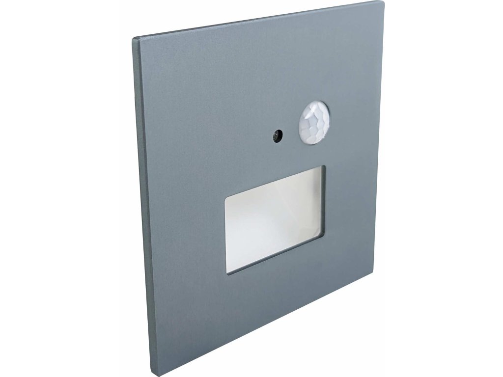 NÁSTENNÉ VSTAVNÉ LED SVIETIDLO. Teleso svietidla tvorí lakovaný hliník, difúzor polykarbonát. Energeticky efektívne svietidlo. Integrovaný vnútorný napájací zdroj CCD LED. Obsahuje infračervené čidlo pohybu a súmrakový spínač. Parametre snímačov nie sú nastaviteľné. Ich hodnoty sú optimálne nastavené pre nočnú prevádzku. Možnosť zmeny teploty chromatickosti pomocou prepínača. Vhodné na decentné osvetlenie schodísk a obvodových múrov. Určené na montáž do krabice KP 68.