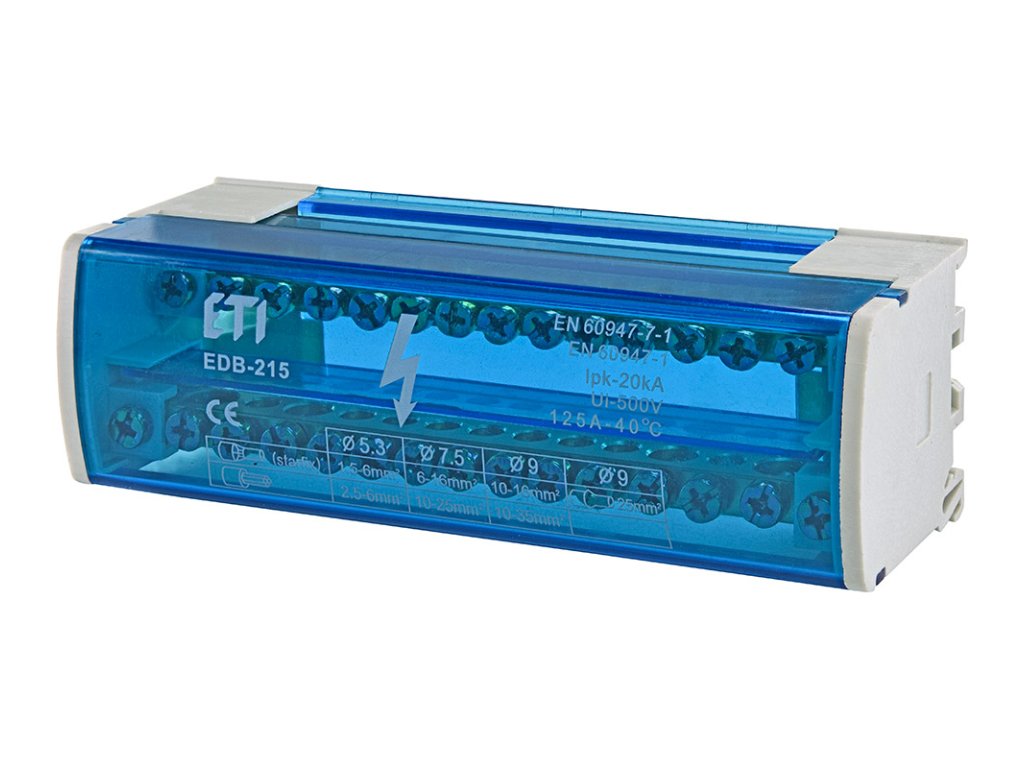 Expertný verdikt: Rozbočovací blok ETI EDB-215 je rozšírenou verziou obľúbeného modelu EDB-207. S kapacitou 15 svoriek na jeden pól je ideálny pre zložitejšie jednofázové rozvody alebo DC aplikácie, kde je potrebné pripojiť veľké množstvo výstupných okruhov (až 15+15). Robustná konštrukcia zvládne prúdy do 125 A a nahrádza neprehľadné zväzky vodičov pod jednou skrutkou.