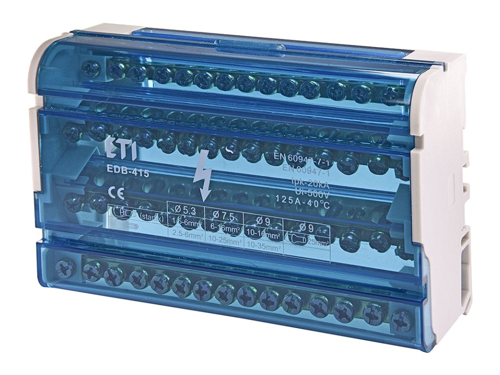 - Pre prívodné káble s prierezom 25 mm² a viac tento blok nie je vhodný (max. 16 mm²). Vtedy použite napr. EDB-413-160A.