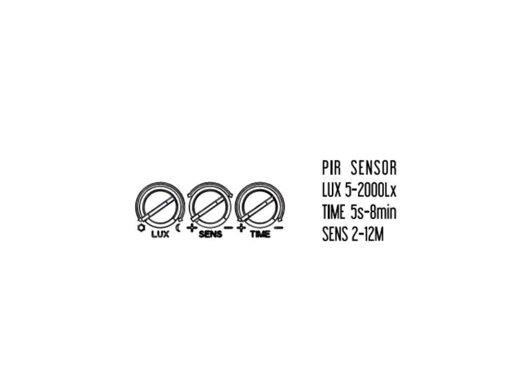 - nastavenie senzora : LUX ( 5 - 2000Lx ), TIME ( 5sec - 8min ), SENS ( 2m - 12m )