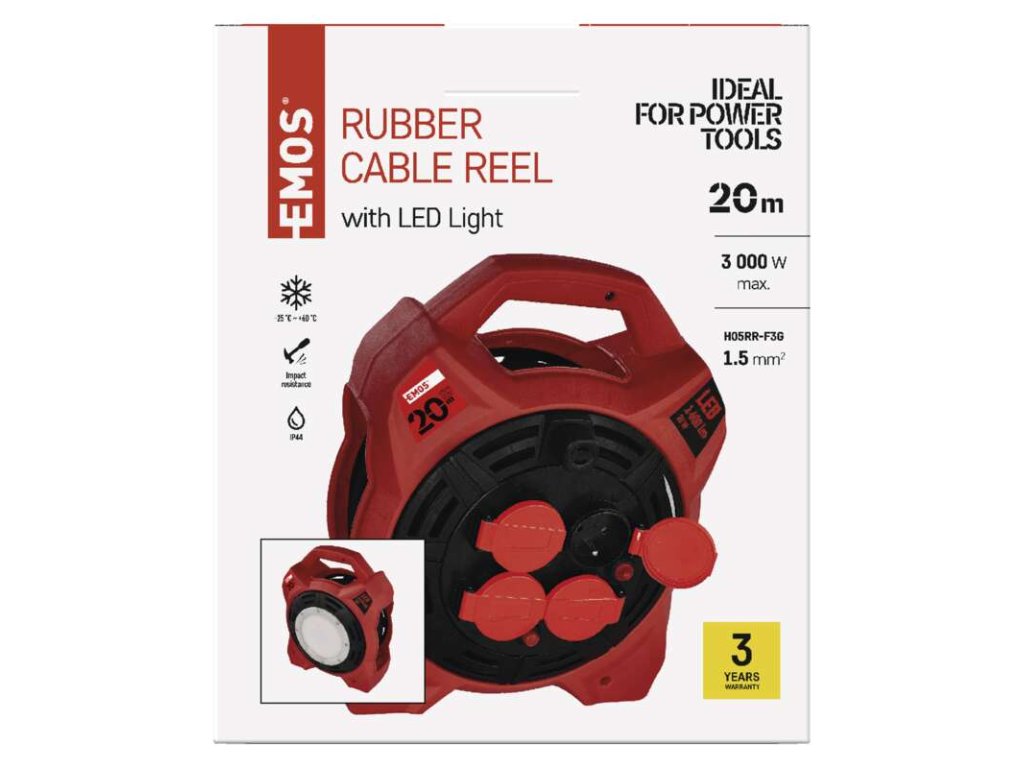 Vonkajší predlž. kábel na bubne 20 m / 4 zás. / guma / 230 V / 1,5 mm2 s reflektorom LED