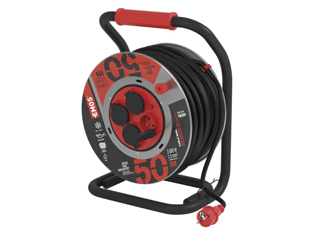 Vonkajší predlžovací kábel na bubne 50 m / 4 zás. / čierny / guma-neoprén / 230V / 1,5 mm2