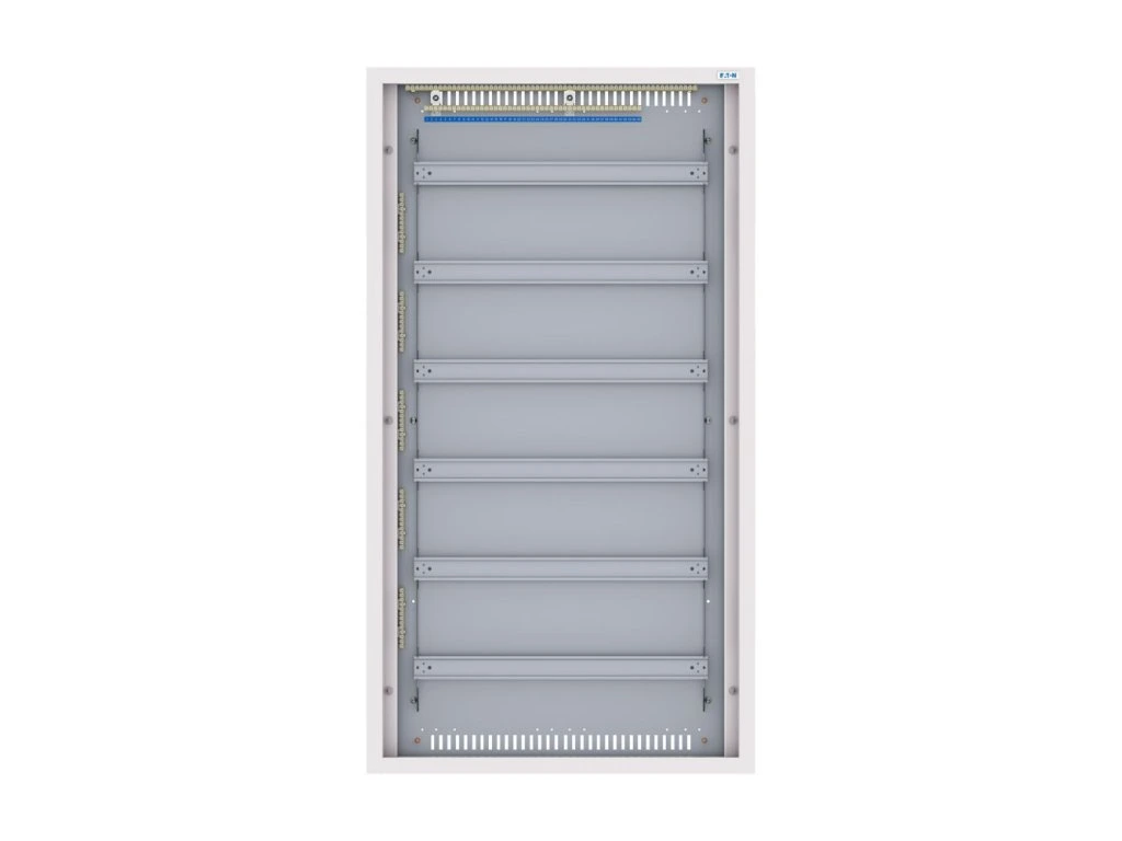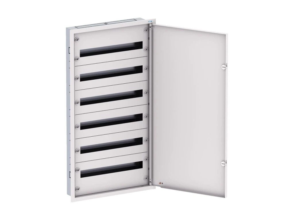 Rozvodnica Eaton BF-U-3S-6/144-D125 predstavuje veľkokapacitné riešenie pre tie najnáročnejšie elektroinštalačné projekty. Označenie 3S definuje unikátnu rozoberateľnú konštrukciu, ktorá je kľúčovým benefitom v priemyselných aplikáciách a pri rozsiahlych automatizačných systémoch budov. Oddelená montáž vane, prístrojového rámu a krycieho panelu umožňuje kompletizáciu celého vnútra v čistom prostredí dielne, zatiaľ čo na stavbe prebiehajú hrubé murárske práce. S mimoriadnou kapacitou 144 modulov v šiestich radoch, menovitým prúdom 125 A a celokovovým telom ide o bezpečné riešenie s vysokou požiarnou odolnosťou a mechanickou integritou IK07.
