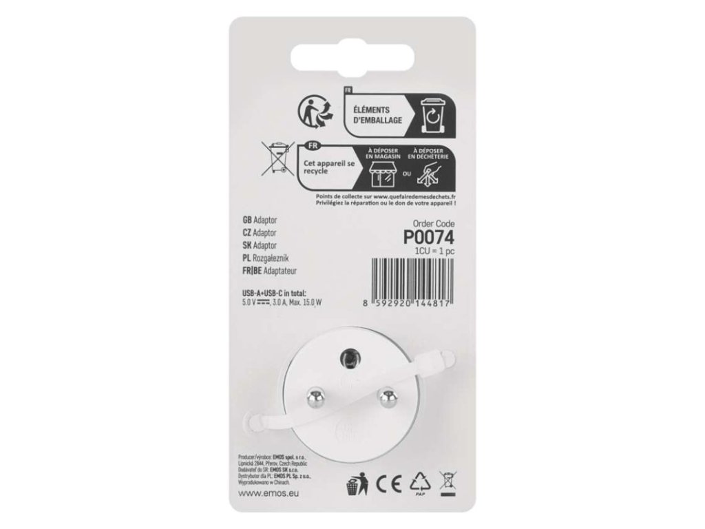 Zásuvkový adaptér EMOS (P0074) – 1x 230V, USB A+C, 15W