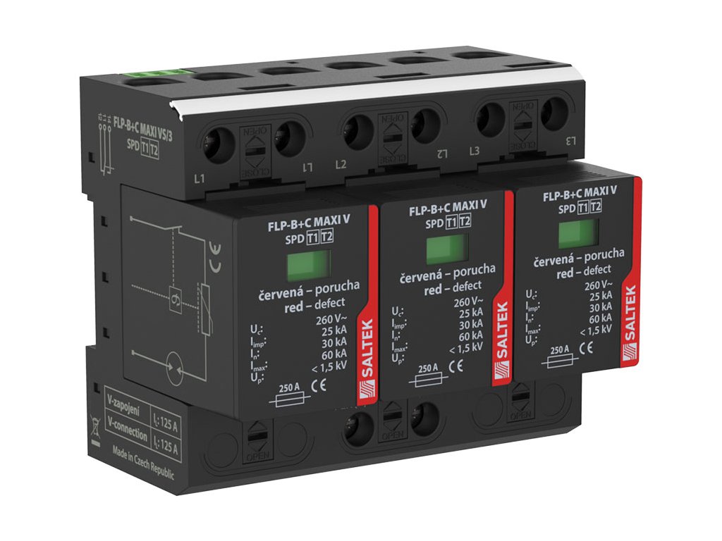 Rýchle zhrnutie: Saltek FLP-B+C MAXI VS/3 predstavuje absolútnu špičku v ochrane pred bleskom. Ide o kombinovaný zvodič Typu 1+2 (B+C) s extrémnou zvodovou schopnosťou 25 kA na pól (impulz 10/350 µs). Táto verzia je navrhnutá pre 3-fázové siete TN-C (spoločný vodič PEN) a je vybavená diaľkovou signalizáciou poruchy pre pripojenie do systému MaR alebo alarmu.