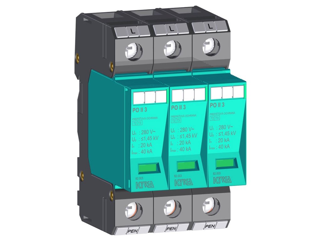 Rýchle zhrnutie: KIWA PO II 3 (82.003) je kombinovaný zvodič prepätia triedy C+D (T2+T3) v 3-pólovom prevedení. Je navrhnutý špeciálne pre siete TN-C (staršie inštalácie alebo priemysel s vodičom PEN), kde poskytuje ochranu pred spínacím a indukovaným prepätím. Inštaluje sa do podružných rozvádzačov.